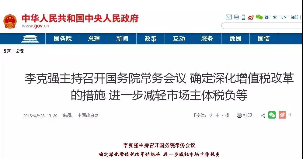 2018年3月28日國務院常務會議決定,將制造業(yè)等行業(yè)增值稅稅率從17%降至16%,將交通運輸、建筑、基礎電信服務等行業(yè)及農(nóng)產(chǎn)品等貨物的增值稅稅率從11%降至10%,預計全年可減稅2400億元。